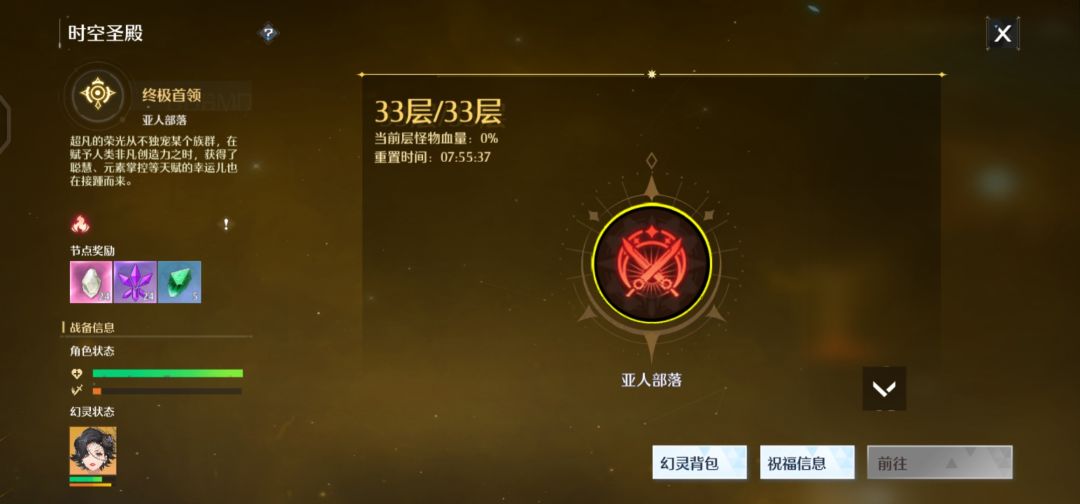 作为一个平民打通表层33层我感觉没什么难度,只是最后一层的时候用了回溯星灵回血了一下幻灵,这个阶段小怪和boss的血都不是太厚所以祝福选择强攻、影歌水晶这种增加爆发和aoe伤害的即可,回复什么的这个阶段基本不需要,想升级幻灵又不想太肝的可以打一打时空圣殿。