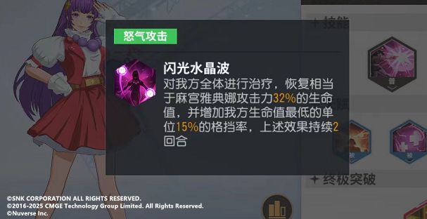当然,即使没有不知火舞,莉安娜也可以基本满足前期游戏的过渡需要,毕竟作为和草薙京同样级别的SR格斗家,她的怒气技能旋转的火花可以有效的削减高血量敌人的血线,在后排5号位可以很好的配合两边的队友进行输出,让每个队友都拥有打肉的能力。