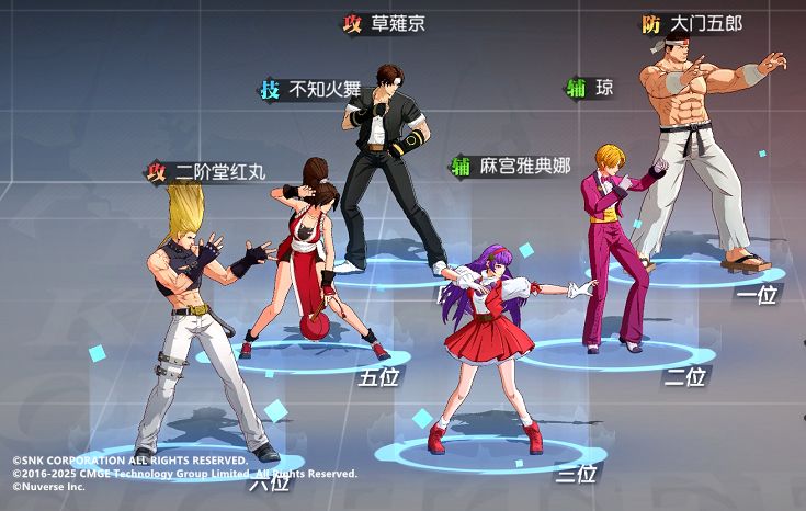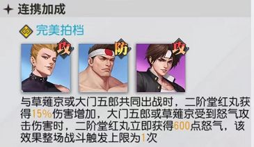 实际上这三兄弟的格斗连携算是游戏里羁绊最明显的了,所以在前期没有抽别的格斗家的情况下,这三人的连携属性能让他们的能力最大化,从而平滑的过渡到其他更加自由的阵容搭配中去。而这三人的站位自然是要让大门五郎站在前排,二阶堂红丸和草薙京在后排进行输出。