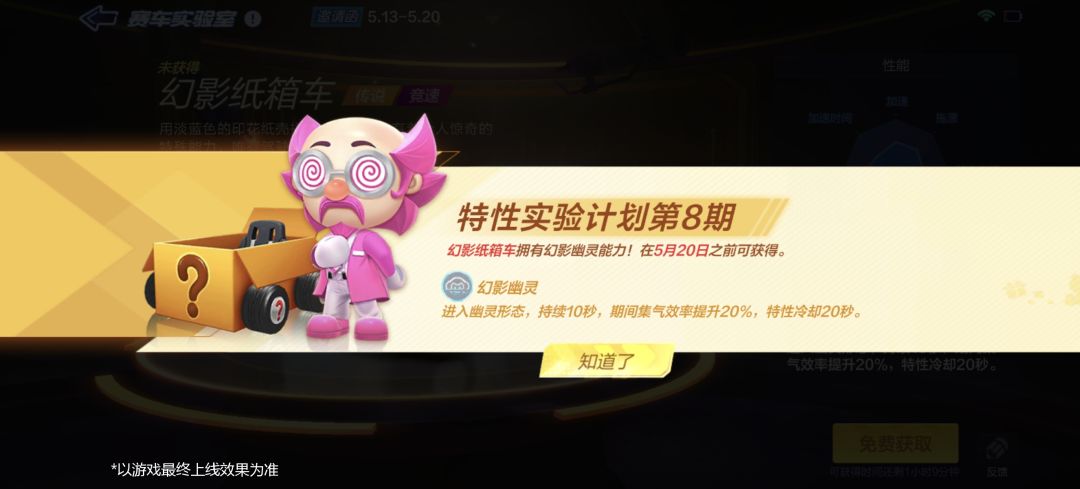 车友们5月20日之前,可以在赛车实验室领取到——幻影纸箱车进行体验,这辆车的幻影幽灵能力,可是走的实力派路线,车友们不要错过体验呀~
