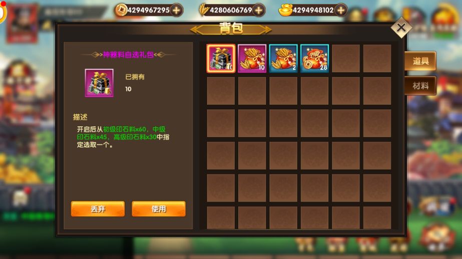 分为道具和材料2个页签,每个页签栏位无限制。道具栏可使用和丢弃道具,材料栏中存放游戏内各系统消耗道具、训练材料可出售成铜钱。