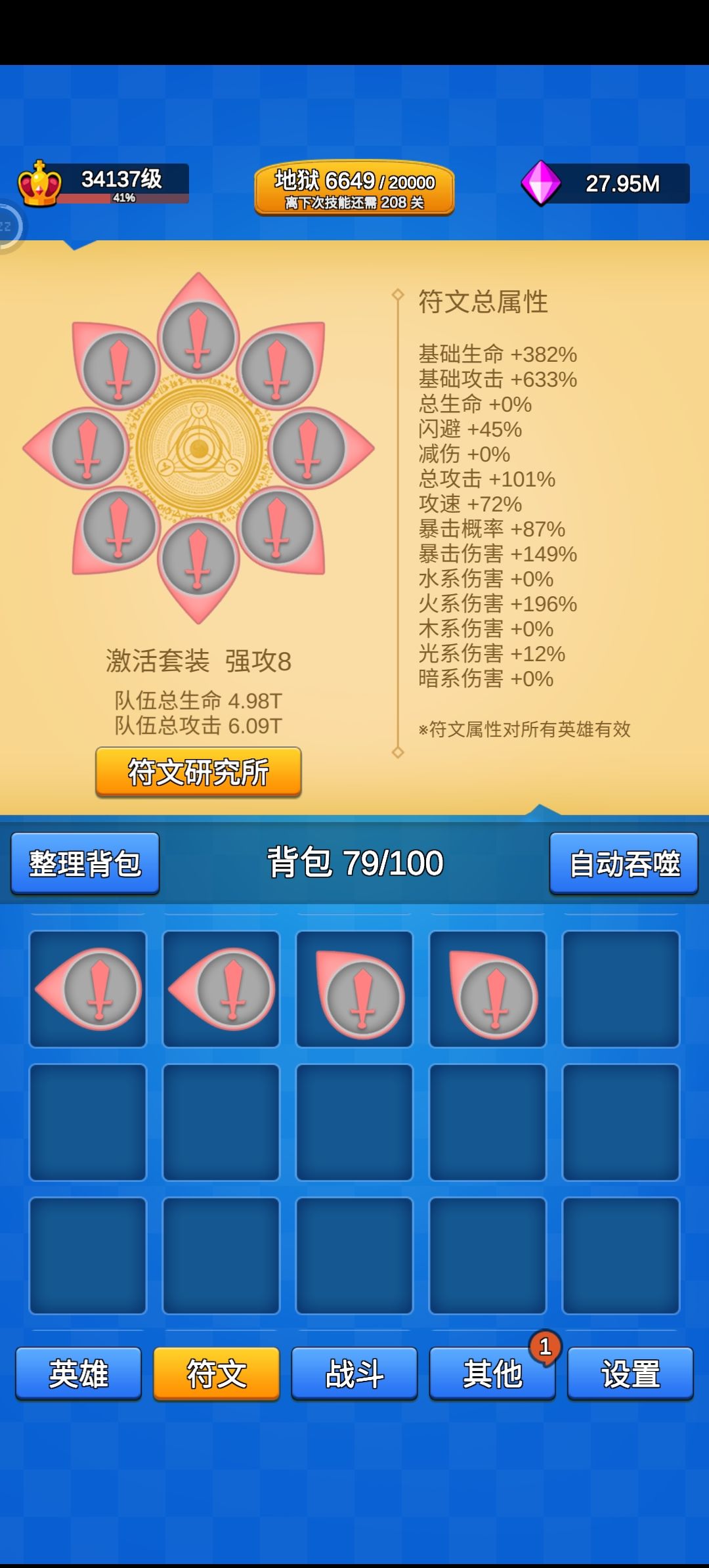 感电会增加整体伤害,因此少一个橙会减少所有橙的伤害。而按照游戏数值设定,第4回合开始,法师的输出基本与其他持平,第5回合开始则略高。所以,全橙之前不建议玩法师。其次,法师血量偏少,除了5种攻击词条以外,需要减伤、闪避和血量符文以撑到4回合之后。简单说就是,能走输出流但不能堆纯输出,因为需要2~3回合热身。