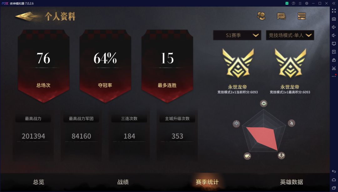 总场次76,夺冠率64%,胜率100%。