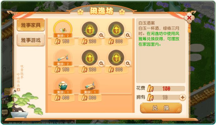 此外,玩家完成庭院扩建后,嘉小圆NPC处将解锁闲逸坊。当你和好友一起参与雅事游戏后,将可以获得风雅筹,用于在闲逸坊兑换高级家具、游戏道具、特殊互动家具等物品!