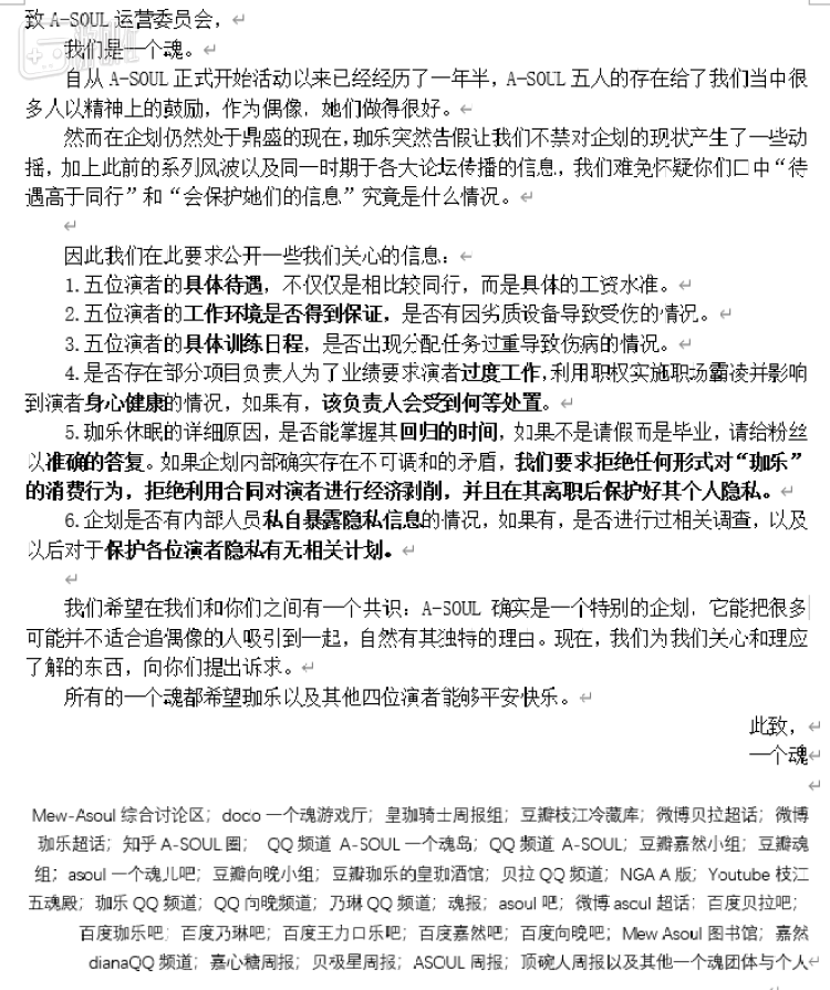 这自然激起了众多粉丝的愤慨,许多人将矛头指向了A-SOUL背后的运营者字节跳动,而此前粉丝自发组建的各类二创团体和粉丝社区也联名发表了一份公开信,期望通过舆论施压来提高几名中之人的待遇。