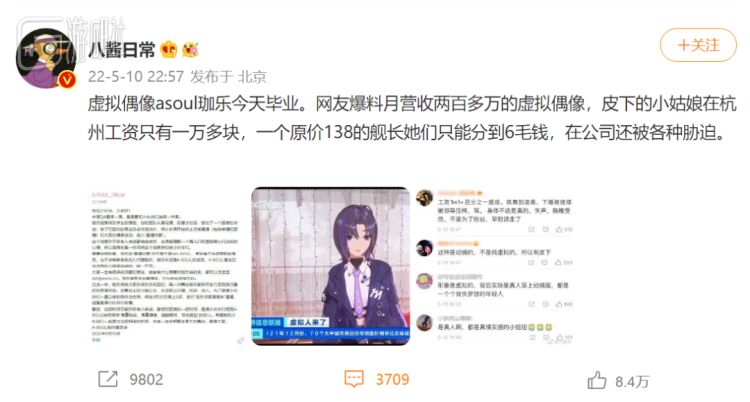 在珈乐解约的消息传出之后,她的中之人(可以理解为“珈乐”这一角色的唯一扮演者)过往遗留在社交平台的言论也相继泄露,从中可以推论出A-SOUL五名中之人的薪资待遇和工作强度远不匹配。