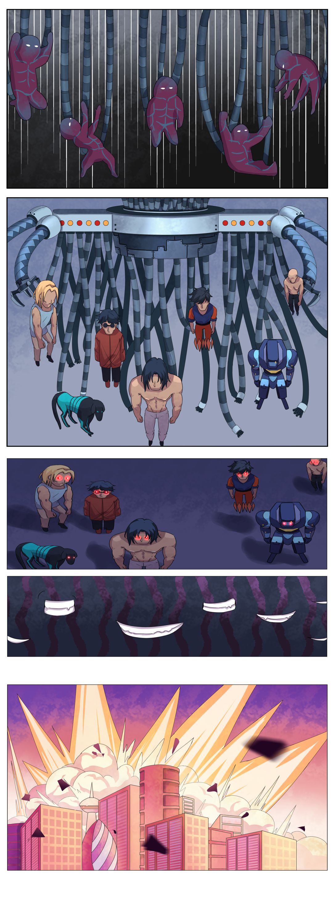 波娜和凯西被抓走,正打算进行改造时警报器突然作响打断了改造,另一边,壮汉、老人、机器人、机器狗...都没能幸免,被改造后的人眼露红光和诡异的笑容!