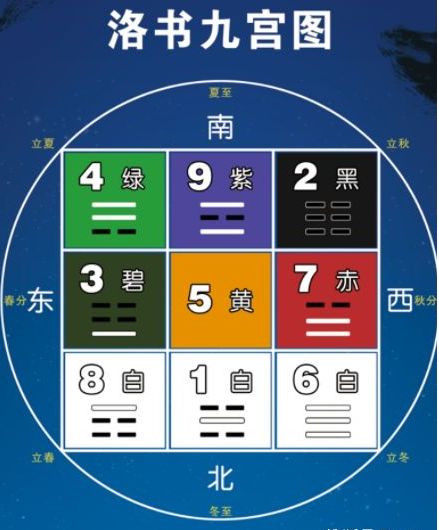 九宫飞星中,一到九是有颜色代表的,一白二黑三碧四绿五黄六白七赤八白九紫。
