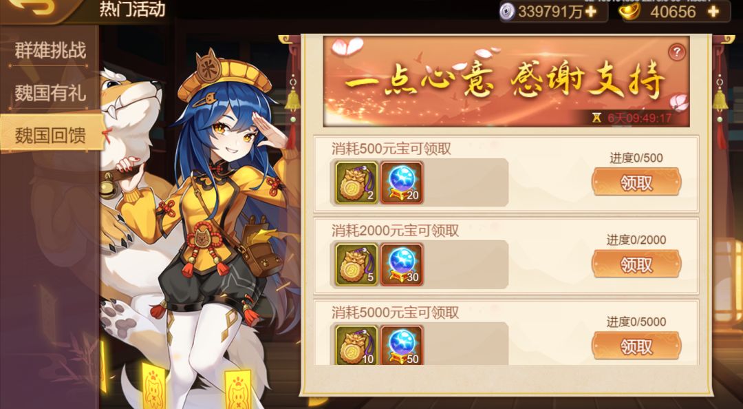本活动为消耗回馈活动,活动期间,达成一定的元宝消耗数量或付费累计额度,即可领取奖励。