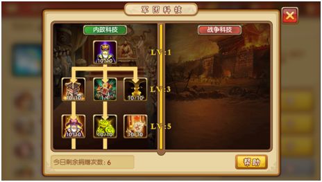在军团科技中,主公可以通过银两和元宝,提升军团科技经验值,同时获得个人贡献度和军团币。军团科技等级决定了军团商店的开放,以及其他对玩家有增强作用的功能。