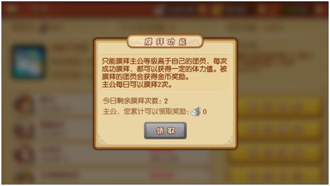 主公可以膜拜军团中比自己等级高的玩家,每次膜拜可以获得体力,被膜拜的玩家则可以领取一定的银两。