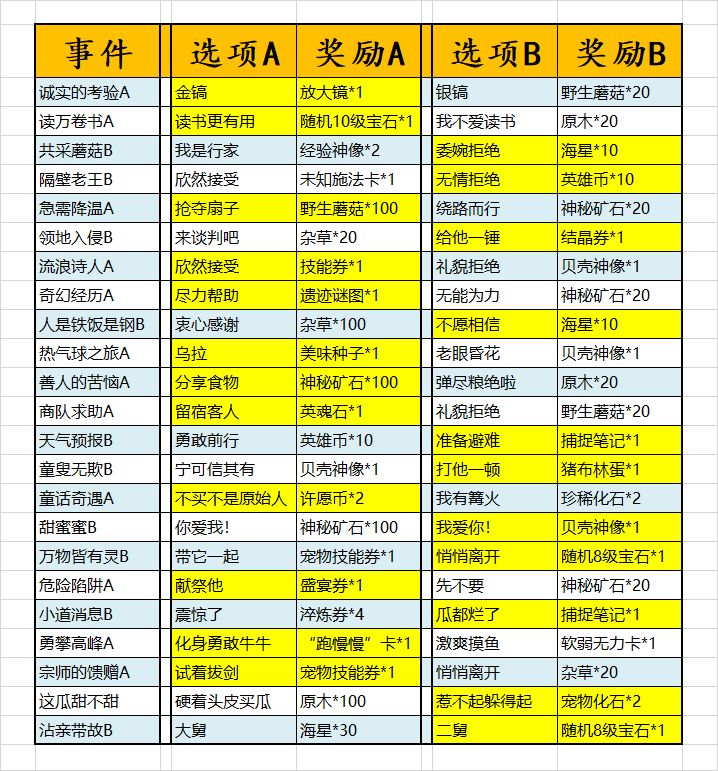 4,问答。不同的AB项选择会等到不同的特定道具。需要什么可以自行决定,具体兑换列表如下: