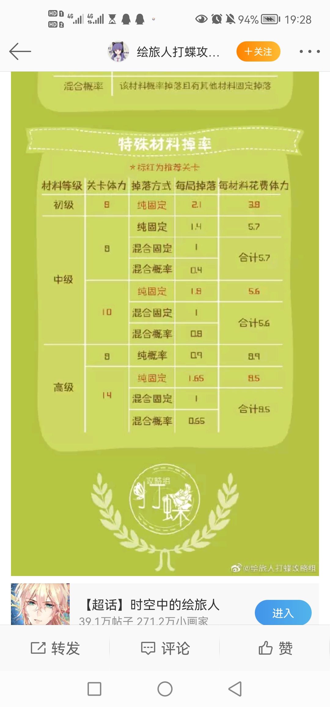 想趁体力减半刷主线材料,但是之前活动商店兑的还没用完,然后找了好久还没找到具体什么关可以打,就自己整理了一份叶赛和乐园的材料(p1),掉率不太会算,截了微博上@绘旅人打碟攻略组的掉率截图(p2-p5)