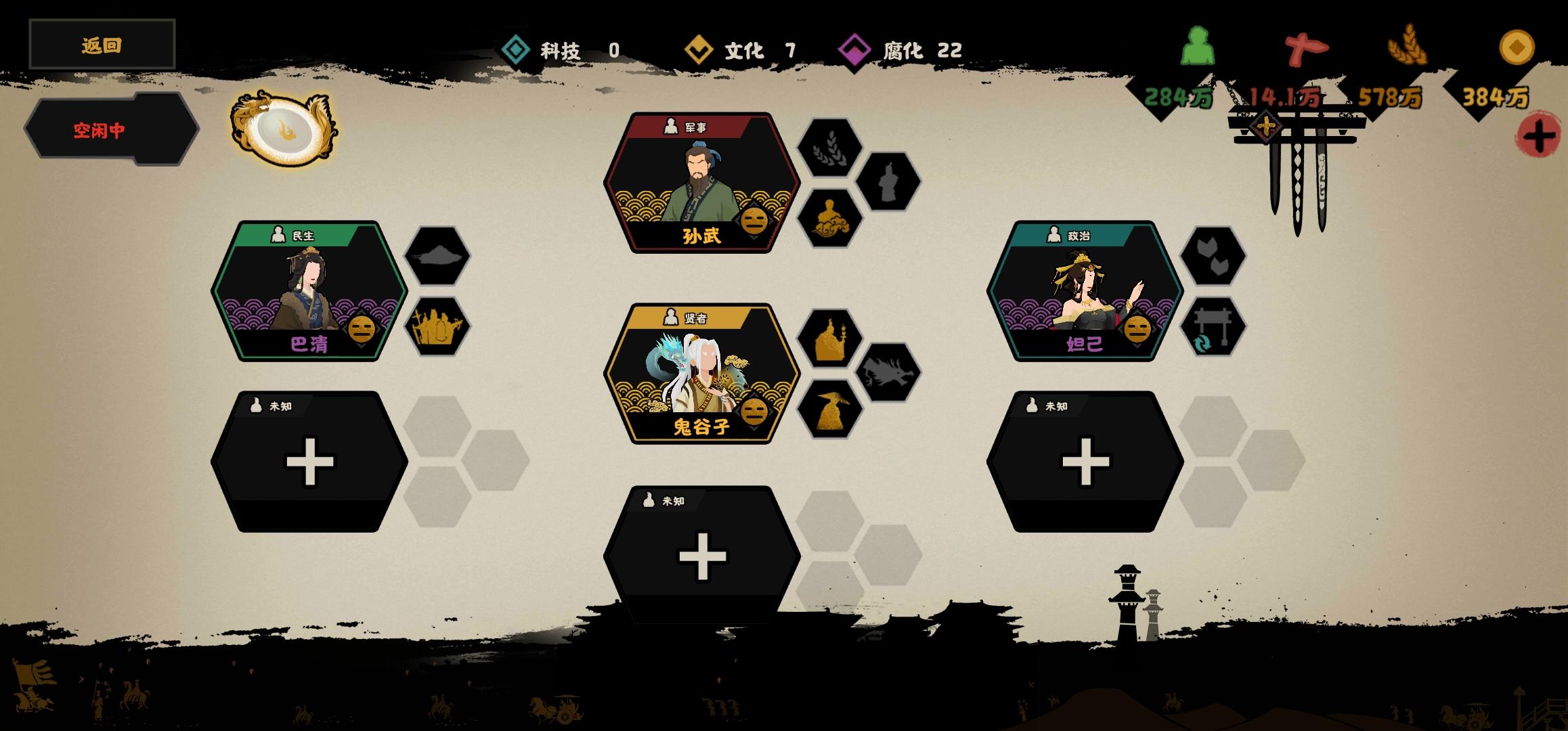 名臣等级低,民生带巴青(二技能无消耗加军团规模)没有换娥皇,只点二技能。星级低的情况下,军事孙武白起二选一,政治周公旦妲己二选一,带妲己名臣推荐带鬼谷子(无消耗加战力),带周公旦(无消耗加大量战力)推荐带孔子(无消耗加大量战力)。如图