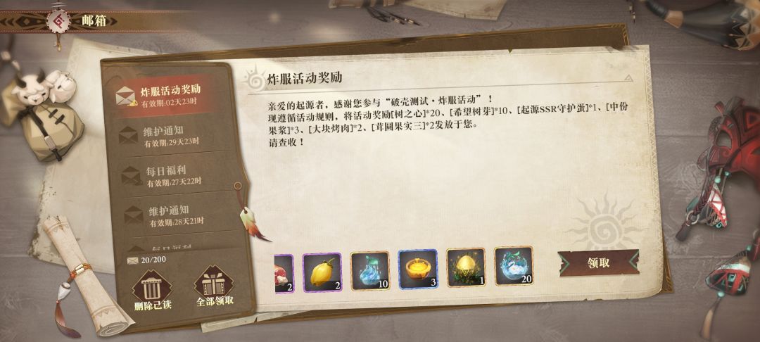 不炸服奖励:[树之心*20、希望树芽*10、起源SSR守护蛋*1、中份果浆*3、大块烤肉*2、茸圆果实三*2]
