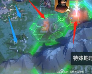 指挥所破坏后,地块区域会有“烽烟”和“碎裂”效果,从下图可看见出蓝色箭头所指为指挥所正常区域,红色所指为指挥所破坏区域显示效果。