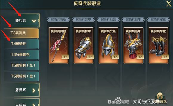 兵种锻造:游戏界面右下角统帅——古代兵装——传奇兵装——翼骑兵——右侧底部锻造