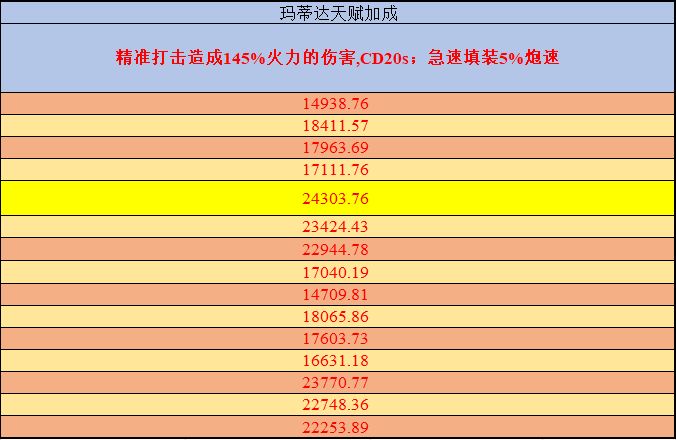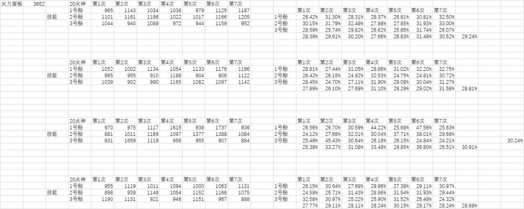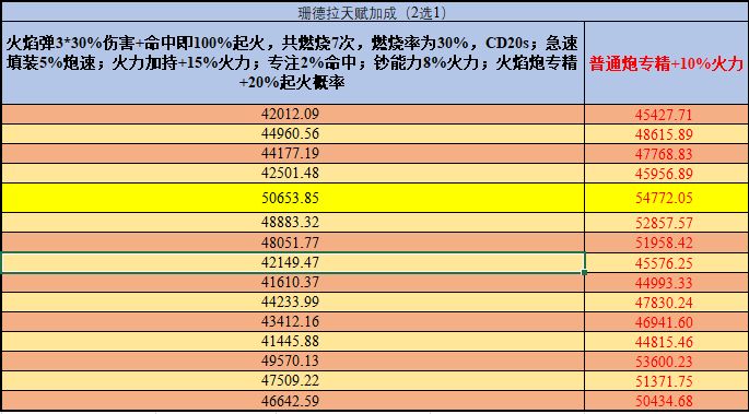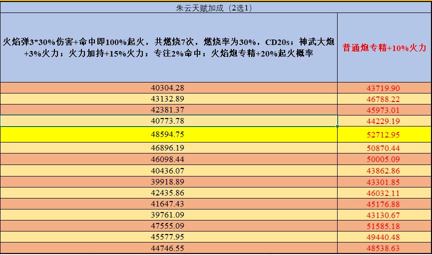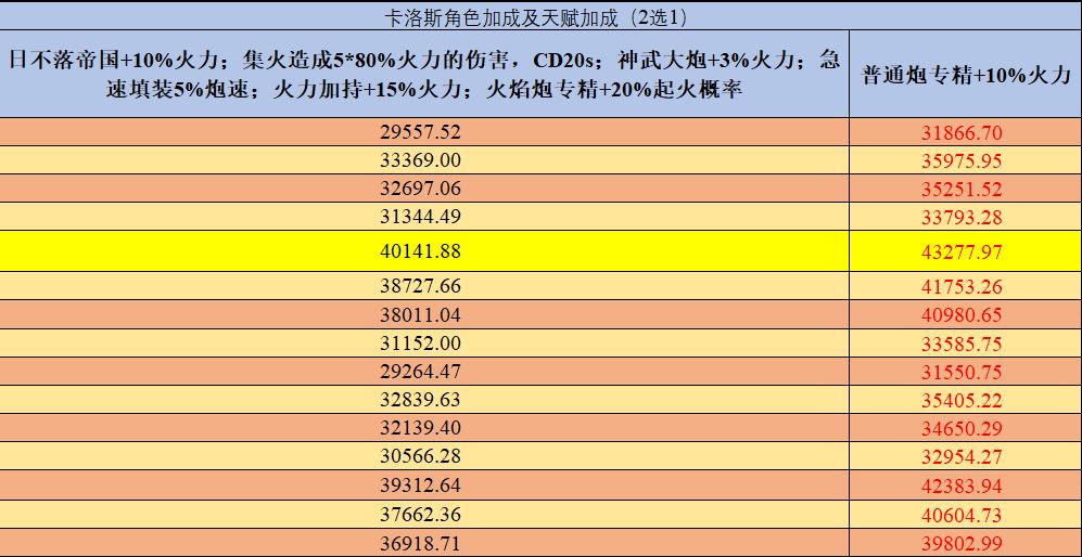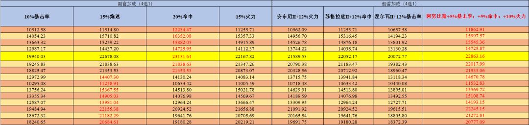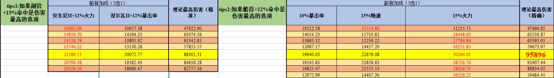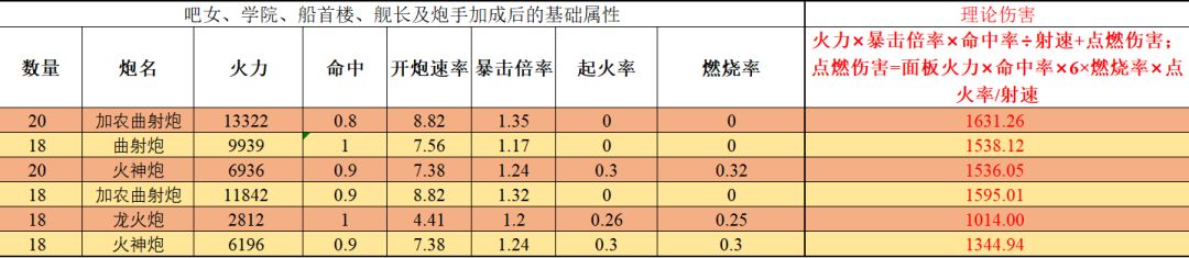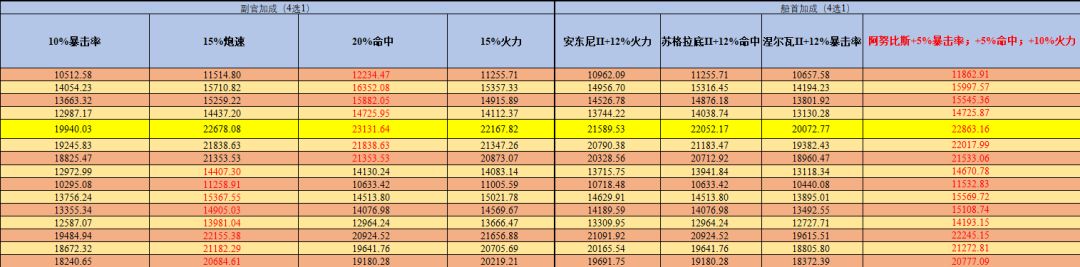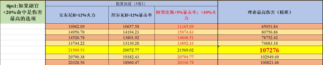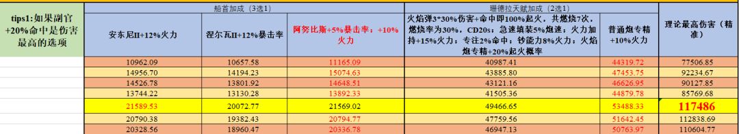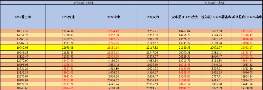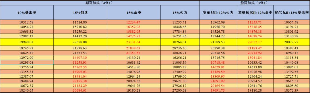 黄色底色的为最高伤害的火炮技能副官船首搭配,加大加粗红色的数字为理论最大伤害。