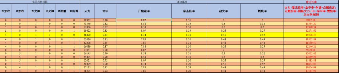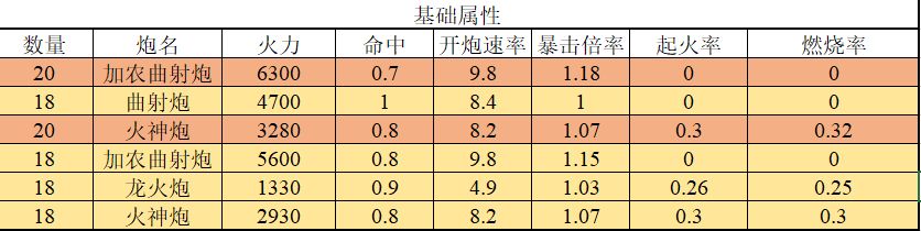 各种火炮组合后的基础数据: