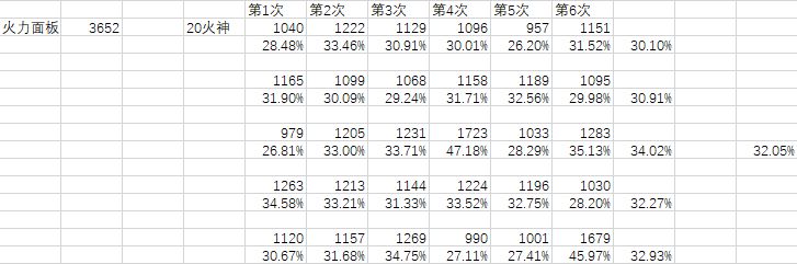 经测试,火焰炮一次点燃共能燃烧6次,燃烧率有比较大的波动(关于燃烧率的测试数据我会放在最后,但由于我比较懒,一个个视频一帧一帧去看太累,我就只取了大概70个样本数,如果有大佬能够去取得至少1000个样本,我相信应该会比我的数据更有信服力),所以我只能选择相信游戏火炮的数据,20火神游戏标32%我就按32%计算,虽然实战测试中这个数值极其不稳定。
