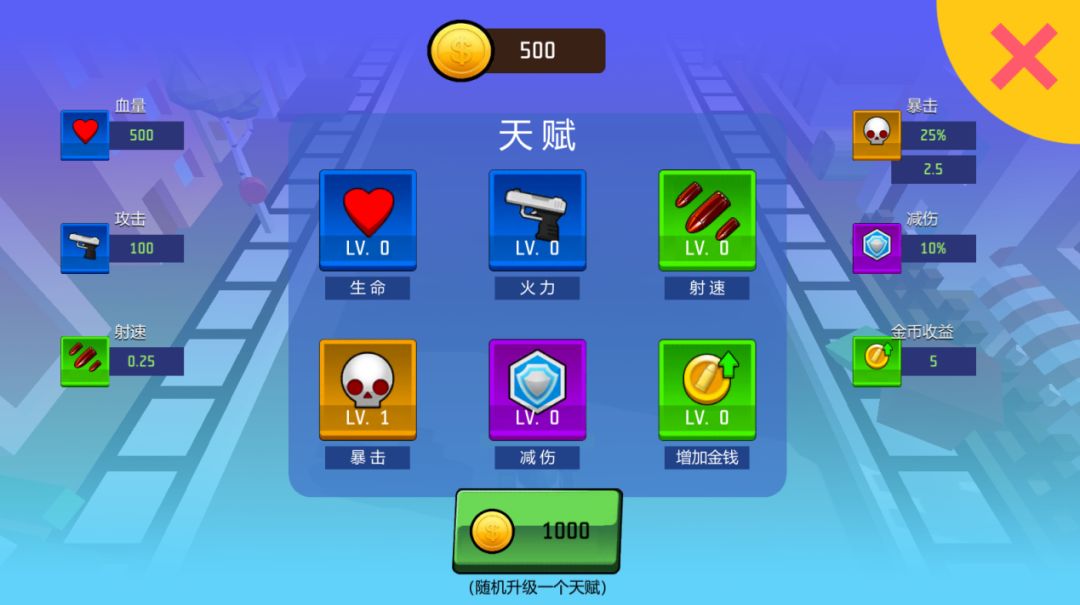 游戏中的天赋主要有6项,【生命】、【火力】、【射速】、【暴击】、【减伤】、【增加金钱】,每次升级或添加新的天赋都需要“随机进行”,花费的金币数量也会逐步递增。但在实战中,天赋等级越高,游戏体验也就越加轻松。