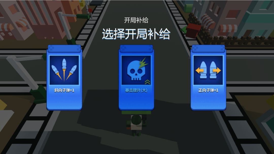 在每一关开始前都有机会选择你的“开局补给”,【斜向子弹+1】、【正向子弹+1】、【暴击提升】、【生命提升】、【伤害提升】、【射速提升】等。这里建议合理安排开局补给,至少增加一次斜向子弹和正向子弹,另外对伤害、暴击、射速各自选择一次,随后根据个人习惯对生命或伤害选择性加强提升。