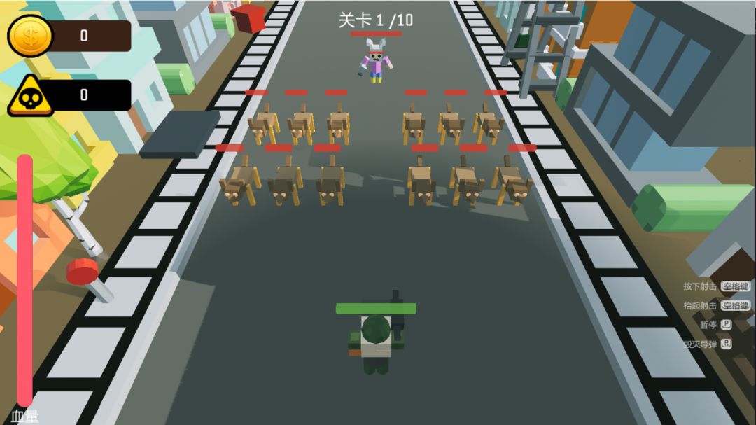 《枪火战士-罪恶城市》目前共有10个关卡,前九个为常规关卡,第10关为BOSS战。玩家在游戏中只需要控制前后左右方向按键以及空格射击按键,快速清空敌人HP血条,并且躲避敌人的攻击,成功击败BOSS后即可获胜。