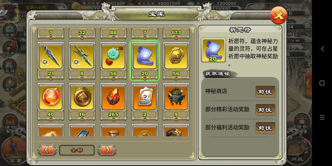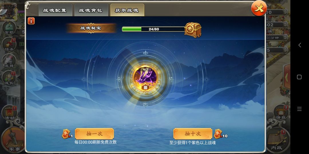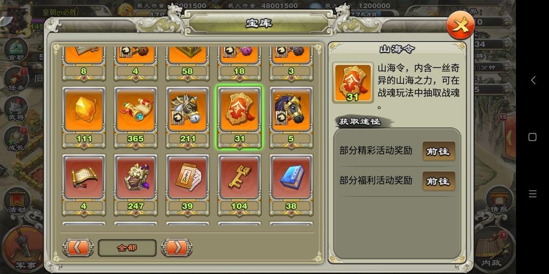举个栗子:这前段时间有绘图滴活动,奖励丰厚!每天要黄金套马3次,觅宝3次,抽取战魂5次!才能每天开一次绘图,连开7次,才能拿到所有滴奖励!这样算来,黄金套3*7=21个,觅宝每天3次免费(不计算在内),抽取战魂5*7=35次!每月每天神秘商店内9点,12点,18点,21点都会有随机更新吉签换祈愿符、山海令,将魂换黄金套、战功策等资源类,日积月累到关键活动不就用得上了么?而且运气好,单抽出奇迹!这活动我都单抽俩金色战魂了