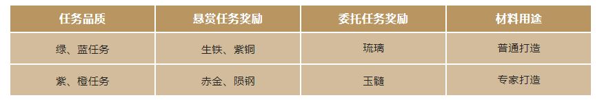 委托任务可分为派遣任务和悬赏任务。它们对应获得的打造材料也各不相同,如下表所示。领主可根据目标挂饰的材料需求,合理筹划任务类型的选择。