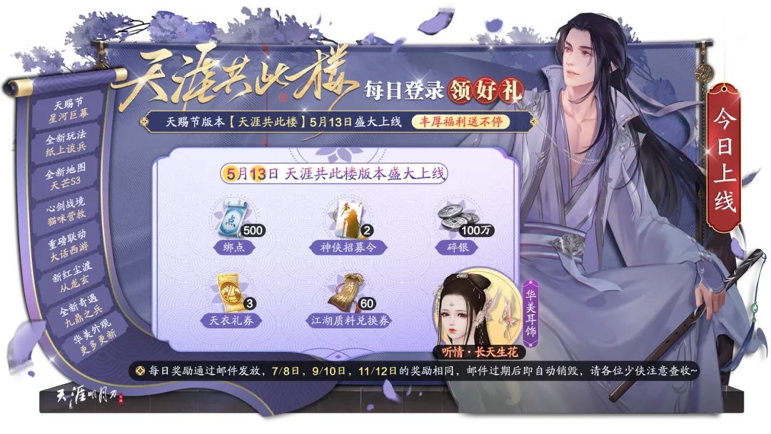 今日登录即可领取初夏豪礼,内含华美耳饰听情·长天生花,耳畔蝶影流连,为你长留春意;另有神侠招募令、百万碎银、质料兑换券等等实用道具,满载诚意,不容错过!