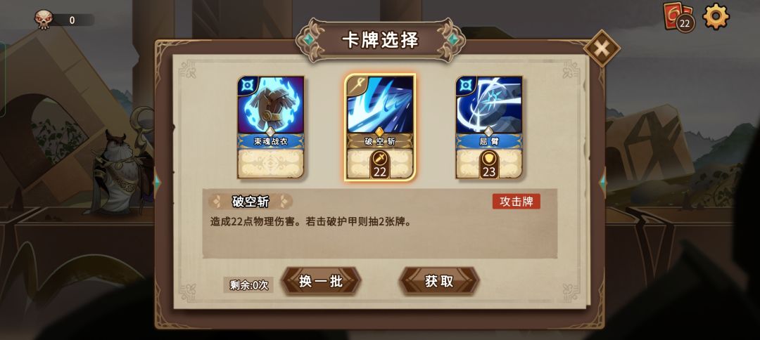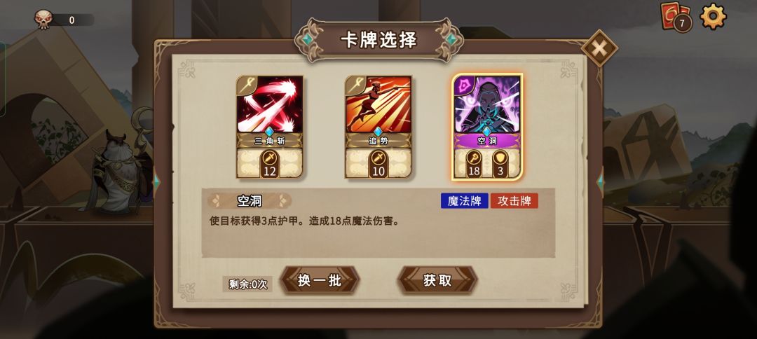 选卡界面,并不是3选1,而是一次性把3张卡全都塞进牌库。