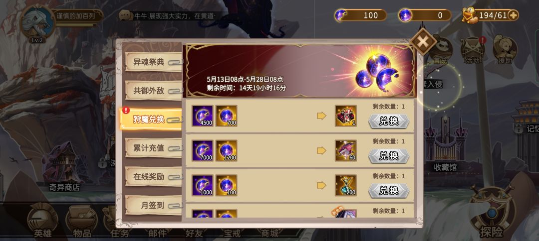 只要把这个活动通关一次,就有足够的物资去兑换200抽啦(活动-狩魔兑换-第三行),如果抽的不好,那就重新建个号再打再抽!按照概率来说,200*3%=6橙是平均水平。