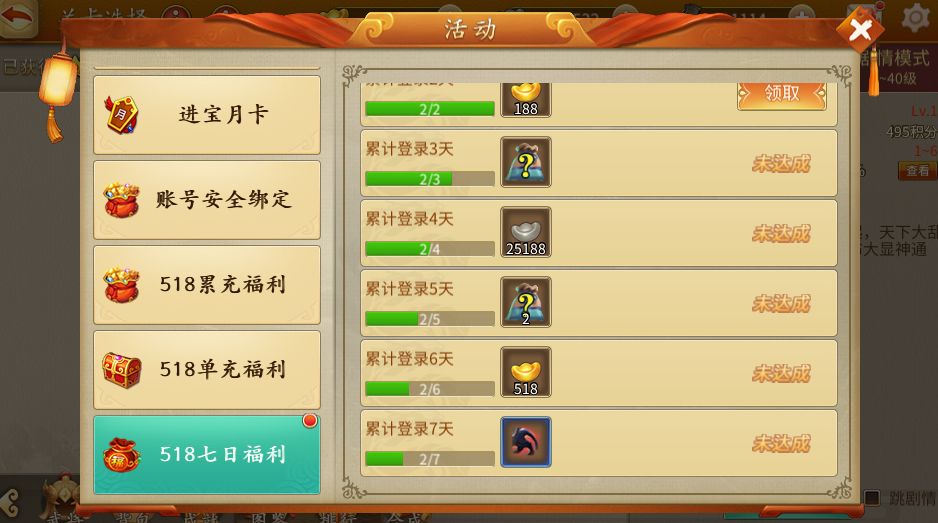 518周年庆七天只要登录游戏都有各类奖励领取。