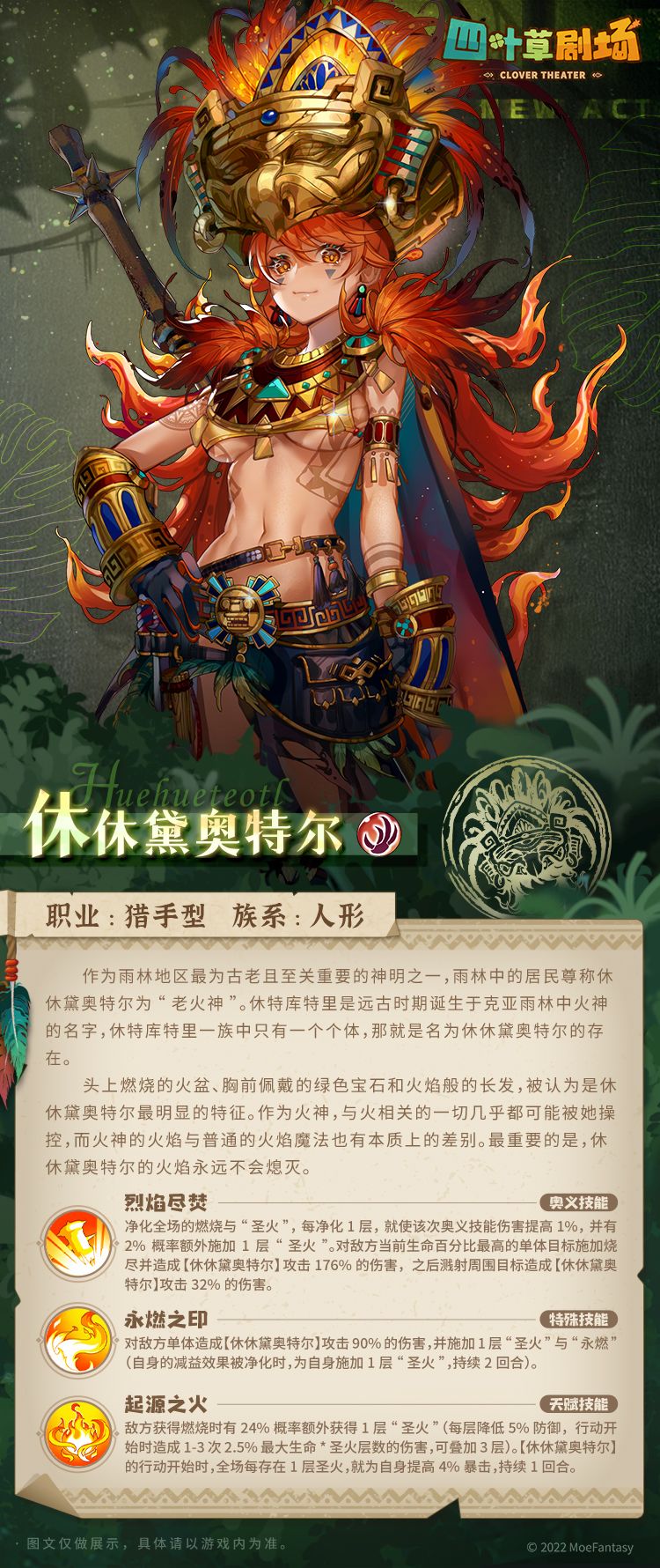 作为雨林地区最为古老且至关重要的神明之一,雨林中的居民尊称休休黛奥特尔为“老火神”。休特库特里是远古时期诞生于克亚雨林中火神的名字,休特库特里一族中只有一个个体,那就是名为休休黛奥特尔的存在。