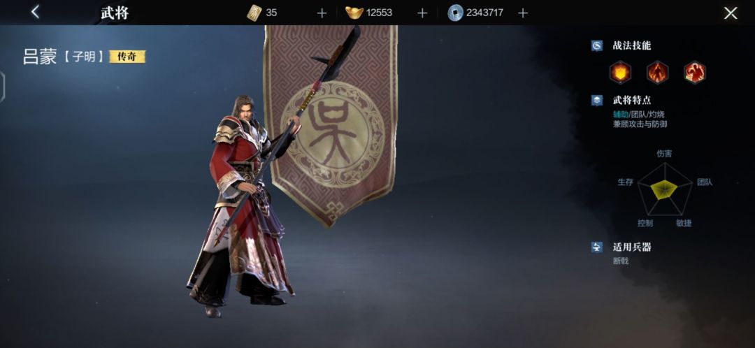 吕蒙受到攻击时,会给自身积累一层斗志,每层提高自身防御力4%,触发间隔10秒,释放无双消耗所有斗志层数进入斗志高昂状态,每层消耗的斗志将提高半径15米内友军攻击力4%,持续10秒。