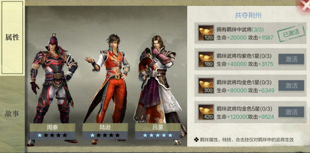 吕蒙+陆逊+周瑜:获得一定攻击和生命加成。
