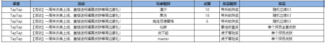 恭喜以下探长获取本次周年庆的活动奖励,请在周三12:00之前带taptap个人主页截屏联系虎子:1835188161进行领奖,超过规定时间领取将自动作废获奖资格。