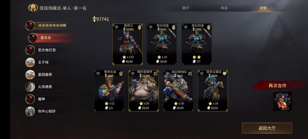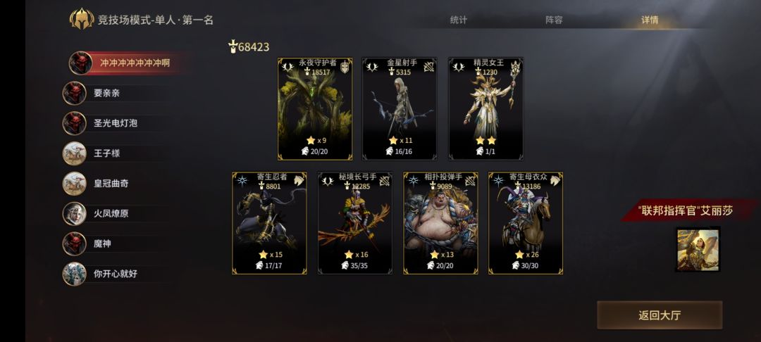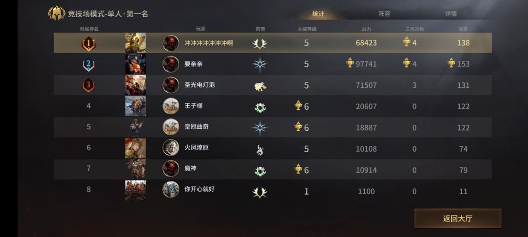 卧槽,太刺激了,差3万战力以下克上🙏老大老二被我接连反杀🙃后几回合格子满了,基本上是划水等着刷三星,就这居然还赢了,赢的有些莫名其妙