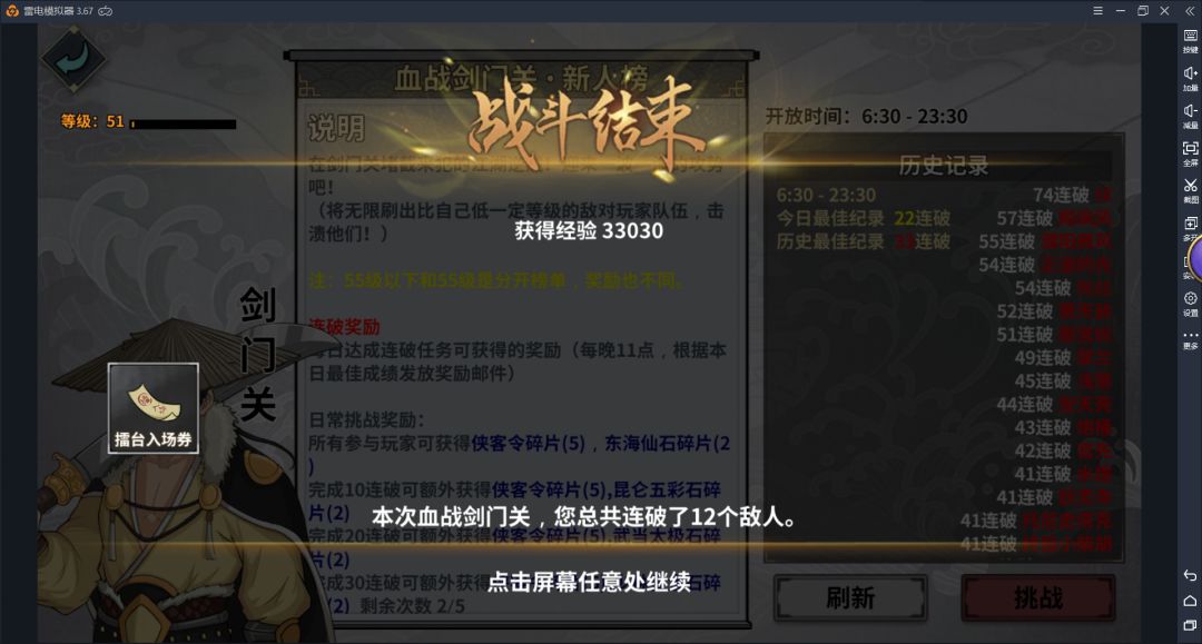 小技巧:在进行血战剑门关的时候,如果没有完成30连破,可以在结算之前大退,这样只消耗次数,不消耗体力