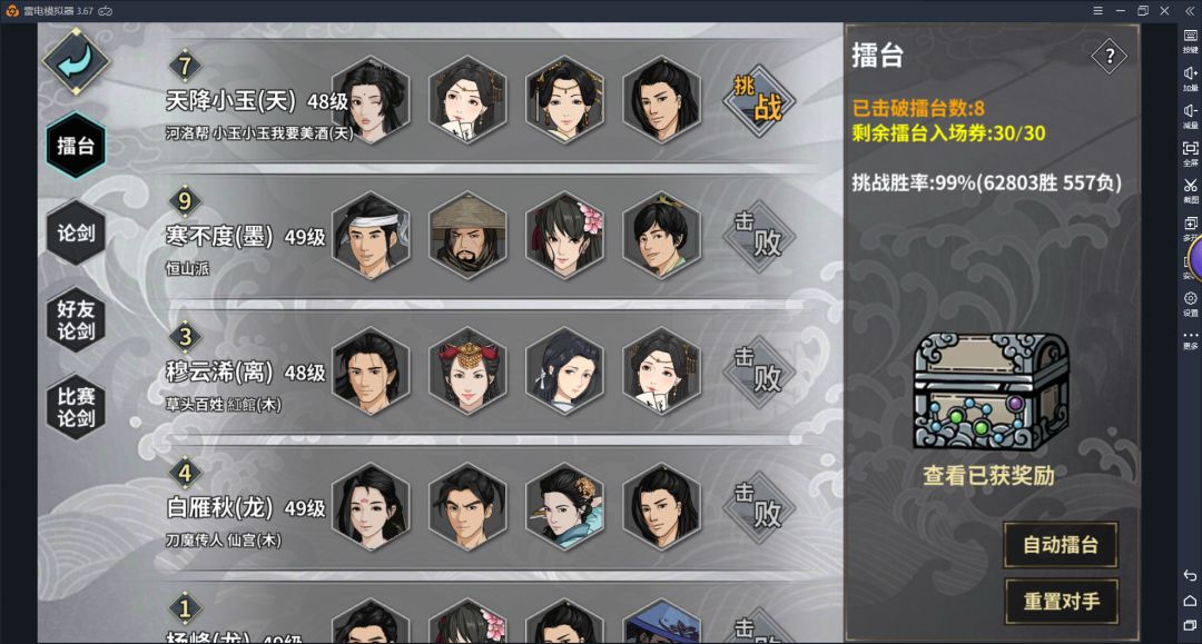 想获得30点体力就要打通一轮,这对于大多数人来讲是很简单的,擂台一般都要比自己低5级以上,但是
