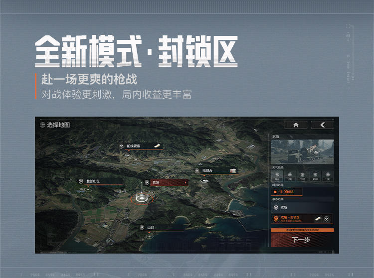 在本次新版本中,农场、山谷、北山地图的战术行动将新增【封锁区】模式。较之普通的战术行动模式,封锁区会有更高的进入门槛、更强的对抗强度、更难的撤离条件和价值更高的收益。这是刺激和收益并存、刚枪伴策略一体的新玩法,也是一条加速积累财富的新通道,先锋们做好准备迎接挑战吧。