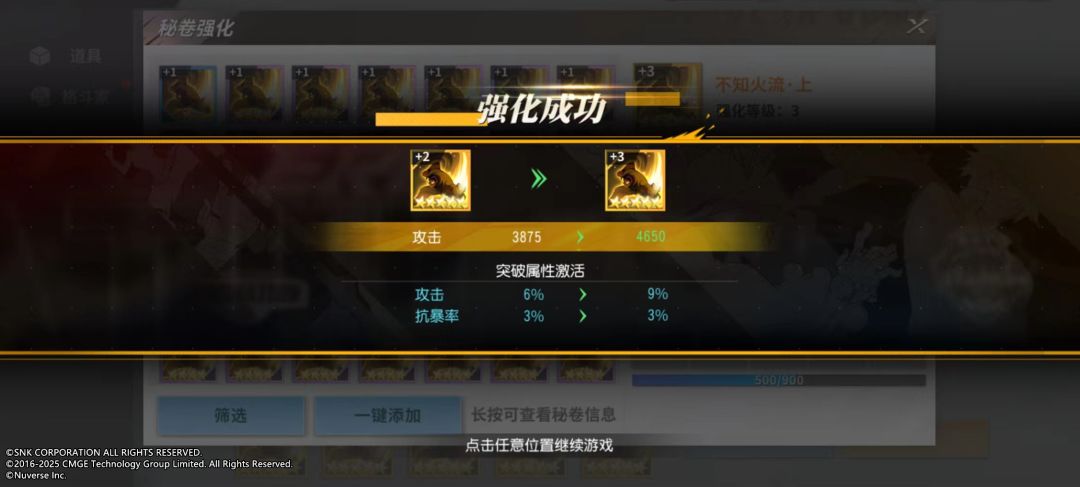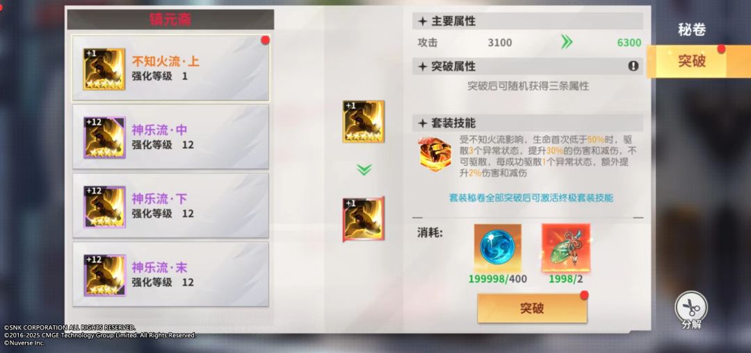 培养秘卷主要分为强化和突破两部分。因为突破是橙色秘卷独有的功能,所以优先解释更为常见的强化功能。我们在挑战首领时,除了秘卷之外,还会掉落培养道具“秘卷残页”。使用秘卷残页,即可为秘卷提供经验值,使其升级。除了挑战首领之外,在每日任务、成就和斗剧商店里,也能获得秘卷残页。