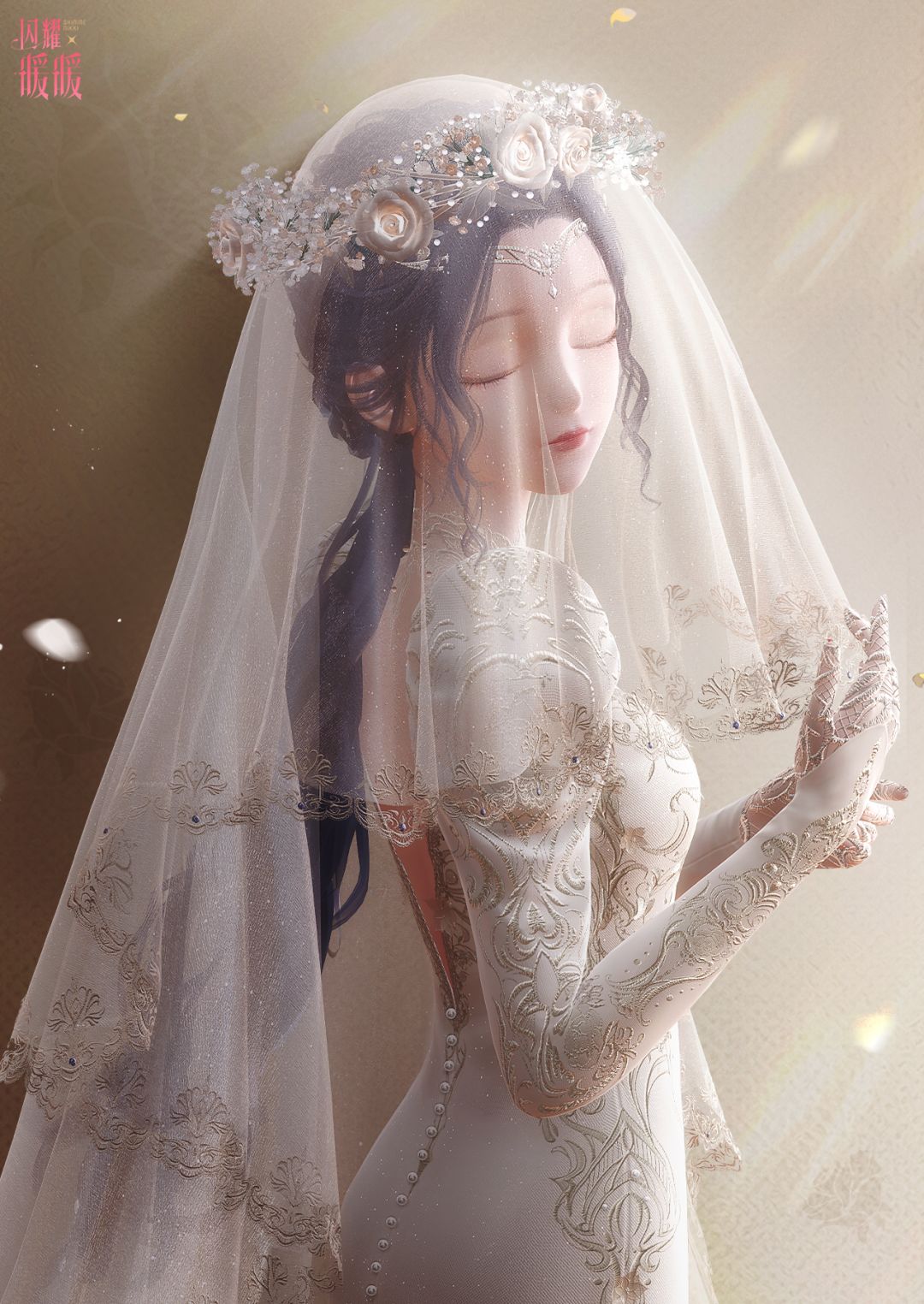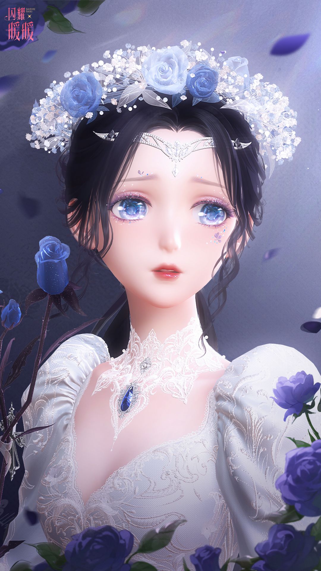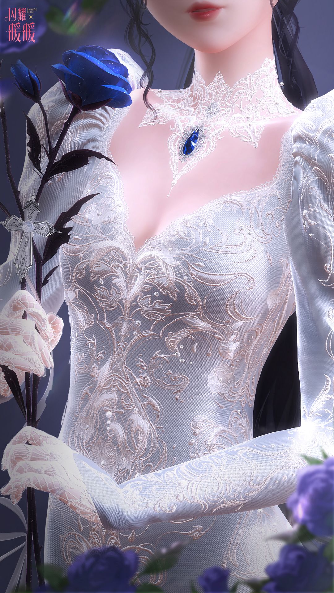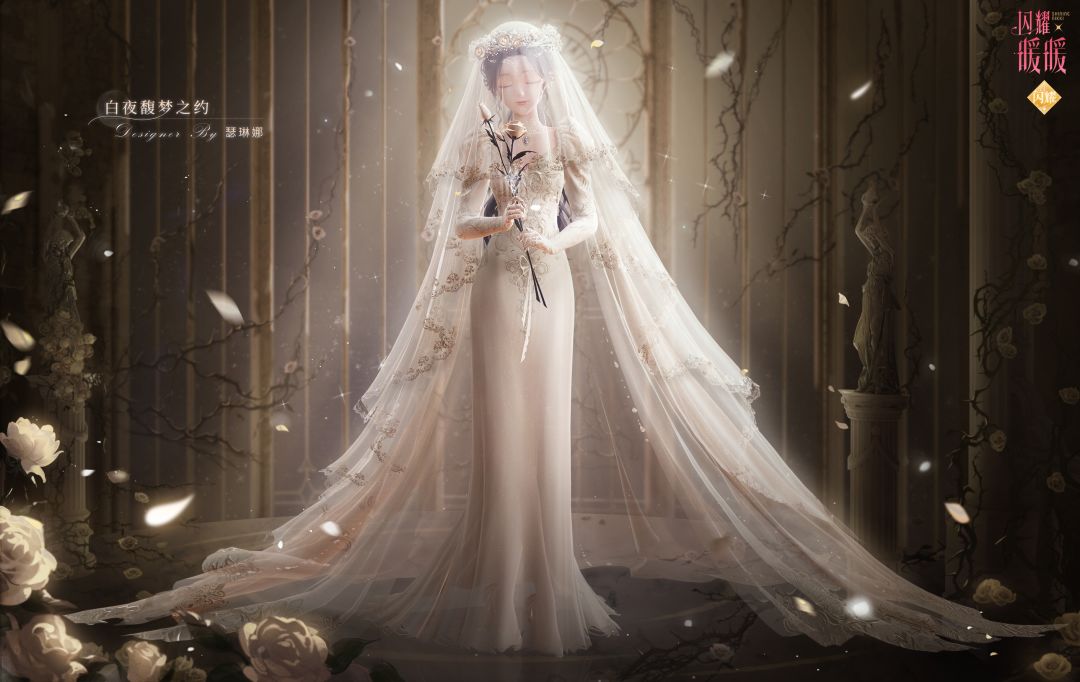 层叠的轻纱犹如银白月辉,手握的银蓝玫瑰似是皎月吻痕,