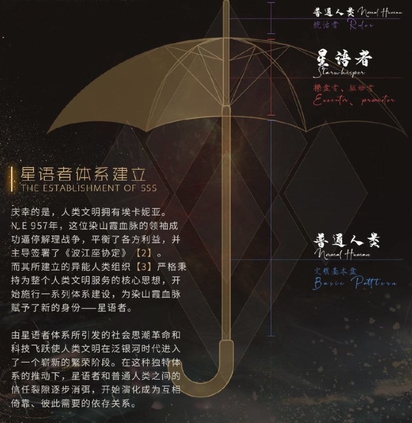二、 内容 伞形社会基本结构分为三大部分:由普通人组成的统治阶层和广大基层,分别占据伞骨的顶部和底部;而星语者则位于两者之间,组成伞面。要阐明这种社会形态为何是伞形,仅从结构上无法完全解读,必须要从功能上去理解:普通人分掌文明统治权和社会基本盘,前者领导文明发展方向,后者生产庞大资源。星语者则结合前者作出的决策以及后者提供的保障,作为文明的驱动者和保卫者在各个前沿领域持续作出贡献。普通人和星语者正如一把伞的伞骨和伞面,伞骨支撑着伞面,伞面又保护着伞骨。失去伞骨,则伞面形同虚设;失去伞面,则伞骨无处可依。二者相辅相成,相互依托,良性循环,已成为适应当代社会发展的一种运作模式。 然而光靠伞骨和伞面,并不足以对伞形社会的结构形成全面认知。通过一些资料的解读,笔者推测,这把伞中还有两个关键因素被忽视了,他们分别是:伞柄和伞撑。[3]先说伞柄,看官方放出的图片: