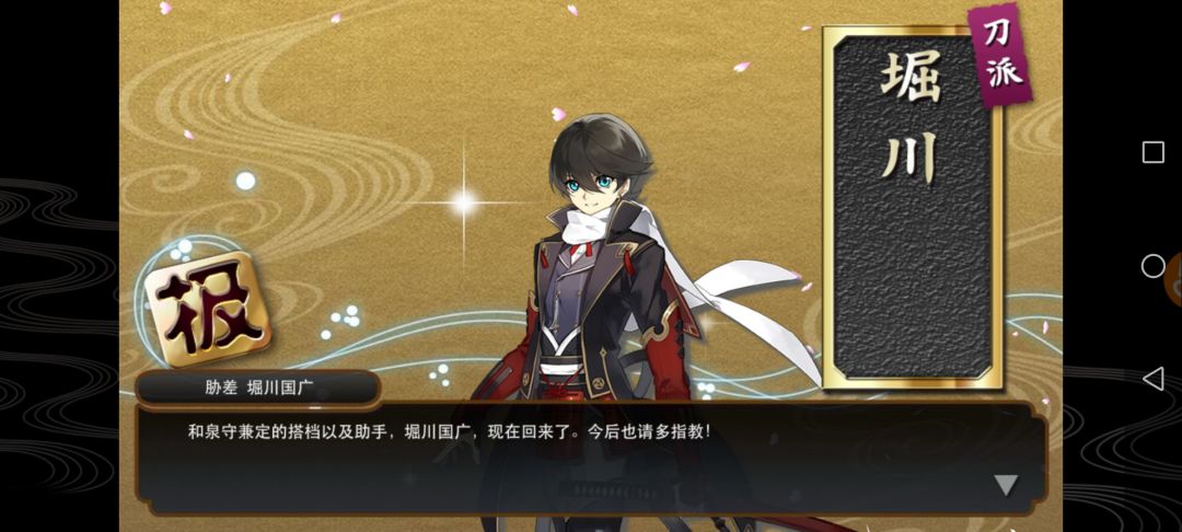 第十九振极化的刀剑,崛川国广,欢迎回家,感觉出去极化回来以后变得可爱了很多,和泉守兼定回来后也是变得帅气了一些,不知道是那边风水养人,还是丢开了过去的阴霾,心里变得强大了呐。还有还有,三封信,封封带着和泉守兼定,我都有些吃醋了呐,哼唧。嘛嘛,不说了,不管怎么说还是欢迎回家,以后请继续多多指教啦~
