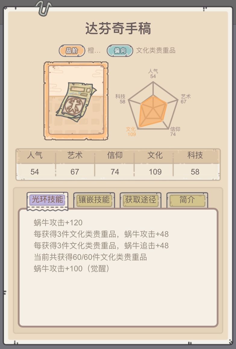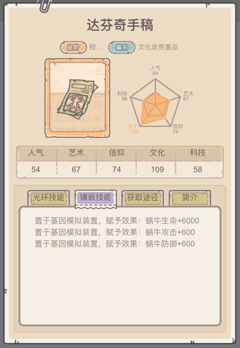 SSS达芬奇手稿,三星+40攻击,每三件+16攻击追击,一共40+16*60/3=360攻击,320追击。 还可以放到基因模拟器,提高2000生命,200攻防。