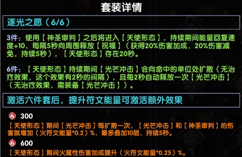 六翼天使形态期间,光芒冲击每释放一次叠一层被动效果,最高为十层,每叠一层“光芒冲击”和“神圣审判”伤害增加能量符文×0.2的百分比,十层即为能量符文×2的百分比