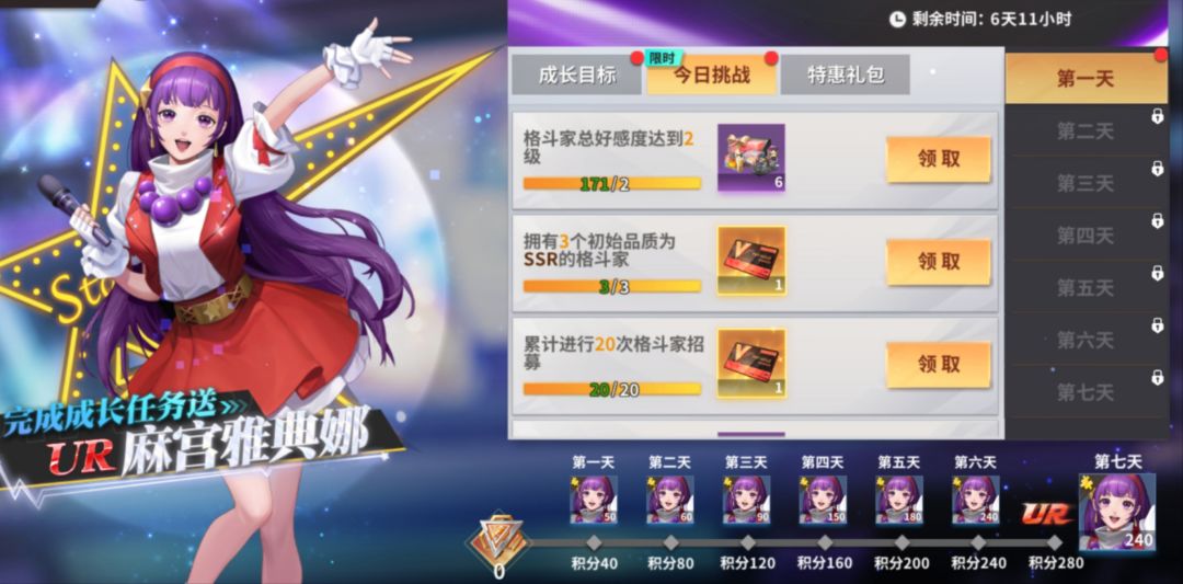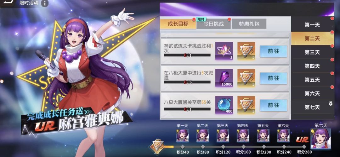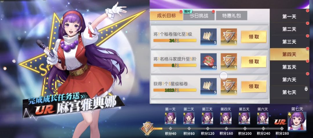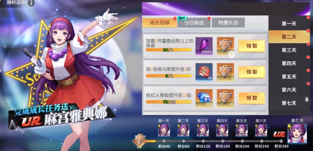 简单的目标拆解:想要获得成长目标最核心的奖励UR麻宫雅典娜,一共需要280点积分,而每天任务积分总数为45点,7天总共有315点,所以并不是要完成所有的任务才能获得奖励,我们可以进行简单的选择。
