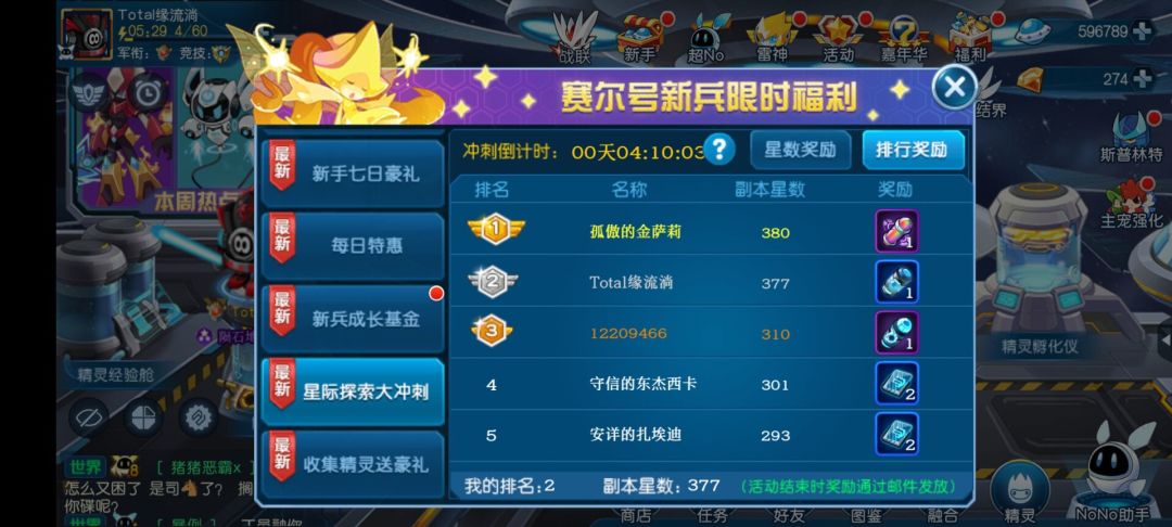 七天边打活动边打推图星星只能拿个379颗星结束,第一位那个最后381颗星结束早知道这样就不和他争名次了毕竟才新手七天推后面的普通关卡也没啥用,万能性格改回归活动也会有,中级改很少见,我就不应该浪费电池和第一名争的他培养的是魔焰猩猩打的远远比我效率高,有魔焰猩猩能拿的星也多。真不愧是玩过推图的玩家,我是第一次接触是被他带动起来的,不然我不会爬这么远我还是个新手真正的新手,咋天就差一颗星就可以通拓梯星去下一个星球打星,我原本可以超越他。