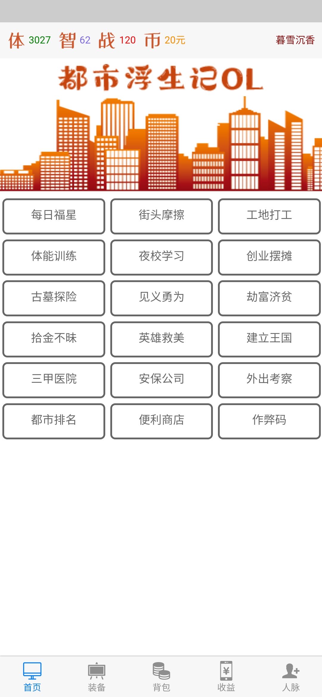 游戏界面UI十分简洁,目前开放了“工地打工 体能训练 夜校学习 创业摆摊 古墓探险 见义勇为 都市排名 便利商店 作弊码”